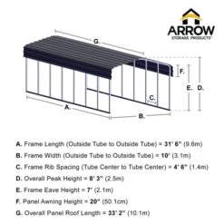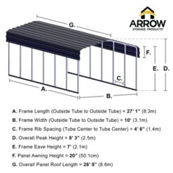 The all-steel Arrow Carport, all-weather shade and shelter solution that’s versatile and practical. Use the Carport to shade your vehicle, truck, ATV, outdoor equipment, rest areas or picnic areas. Great for storing boats, picnic and outdoor furniture and summer toys in the off-season. Each Arrow Carport is wind and snow load rated, designed to take on tough weather conditions and stand up to accumulated snowfall. Its galvanized steel roof is made to protect against corrosion, rust, and the elements and features an attractive roof with a Charcoal finish. The Carport is assembled on a tough all-steel, 2 in. tube frame, made to reinforce stability and strength in the structure, and has a powder-coated finish that resists corrosion and rust. Easy to install, the Carport comes with slip-fit connections with pilot holes and self-drilling screws making this unit easy to build straight out of the box.