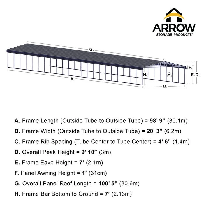 Arrow Carport, 20 Ft. X 100 Ft. X 7 Ft. Charcoal