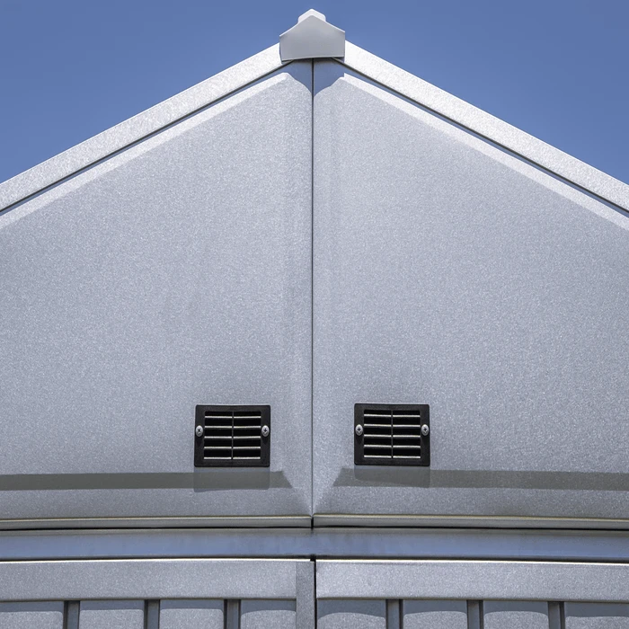 The Arrow Elite series storage shed has an attractive squared wall design and textured wrinkle paint in an anthracite finish, making it a welcome fixture in any backyard, garden or outdoor setting Made Galvalume steel with highly anti-corrosive aluminum and zinc plating, this steel shed is built to last! The Elite series sheds also feature a tall 72 in wall height for added headroom, plus extra walk around space The rigid reinforced swing open doors with brushed nickel key lock handle allows for easy access to the interior, while allowing storage against the front wall In addition, gable vents provide increased air flow to the shed’s interior All hardware is included for assembly