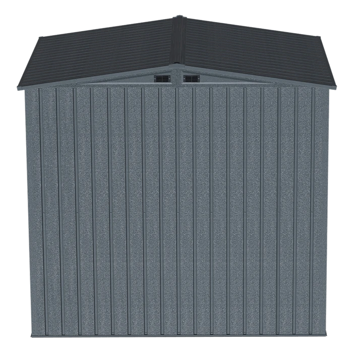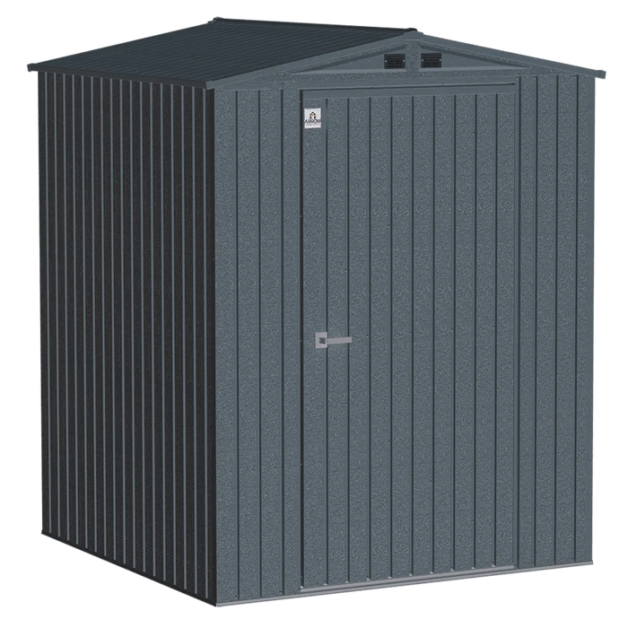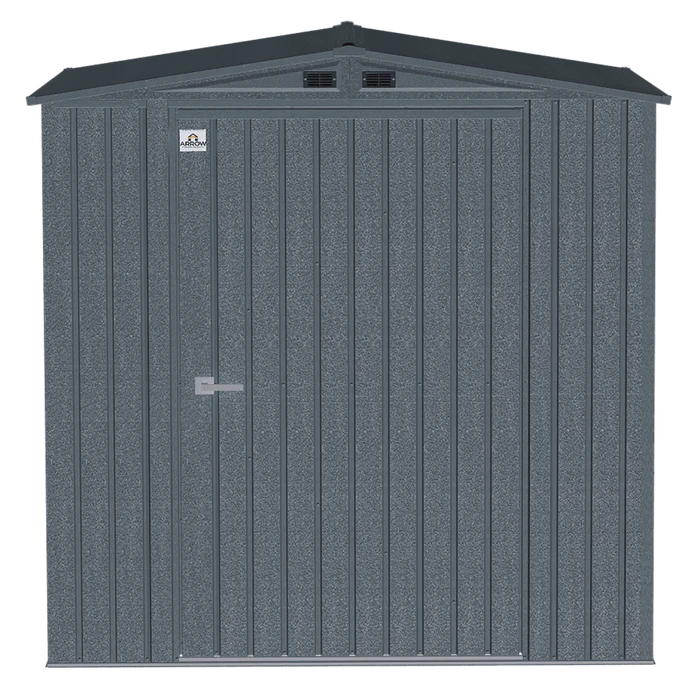 The Arrow Elite series storage shed has an attractive squared wall design and textured wrinkle paint finish, making it a welcome fixture in any backyard, garden or outdoor setting. Made from Galvalume, a steel with an aluminum and zinc plating which is highly anti-corrosive, this steel shed is built to last! The Elite series sheds also feature a tall 72 in. wall height and high gable roof for added headroom, plus extra walk around space. The rigid reinforced swing open doors with brushed nickel key lock handle allows for easy access to the interior, while allowing storage against the front wall. In addition, gable vents provide increased air flow to the shed’s interior. All hardware is included for assembly.