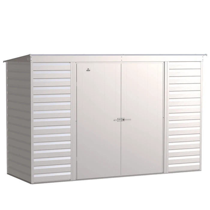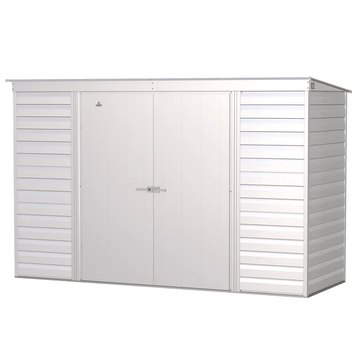 The Arrow Select line of strong, sturdy steel storage sheds is a pleasant addition to your backyard. Made with galvanized steel that is treated to provide long-term protection against corrosion and rust, Arrow Select sheds are engineered to protect your stored items from the elements. Inside, the 71 in. walls provide extra headroom, vertical storage space, and added entryway clearance. That makes it great for storing ladders, rakes, pole saws, and anything you want to pile high. The Arrow Select line also has a high gable roof to prevent pooling of rainwater and debris, built-in air vents for better circulation, and locking door handles for security. It also has a smooth, strong Sherwin-Williams® paint finish that protects it from the elements and gives the steel extra protection from rust and corrosion.
