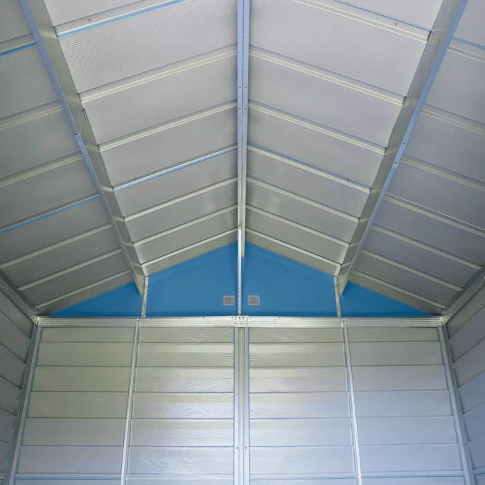 The Arrow Select line of strong, sturdy steel storage sheds is a pleasant addition to your backyard Made with galvanized steel that is treated to provide long-term protection against corrosion and rust, Arrow Select sheds are engineered to protect your stored items from the elements Inside, the 71 in walls provide extra headroom, vertical storage space, and added entryway clearance That makes it great for storing ladders, rakes, pole saws, and anything you want to pile high The Arrow Select line also has a high gable roof to prevent pooling of rainwater and debris and locking door handles for security It also has a smooth, strong Sherwin-Williams paint finish that protects it from the elements and gives the steel extra protection from rust and corrosion