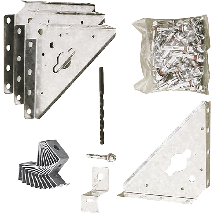- Includes: (4) steel corner gussets, perimeter clips, lag bolts, and a 1/4″ masonry drill bit