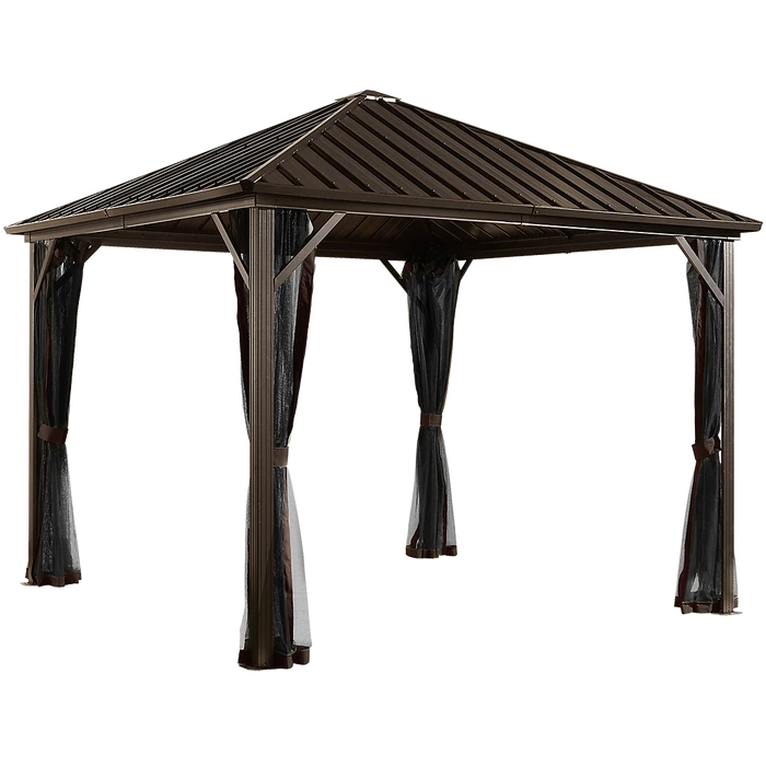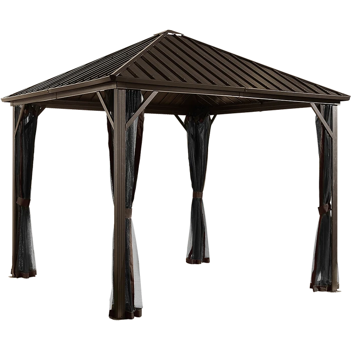 What to say about the Sojag Dakota gazebo except that it is the ideal shelter. With its aluminum frame and galvanized steel roof, it will prove its durability. Find the advantage of a canvas roof providing 100% of shade without the disadvantage of having to change it. The galvanized steel roof does not change color, is waterproof and durable. Available in three sizes, you can choose to adapt it to the available space in your yard. Worry free purchase!