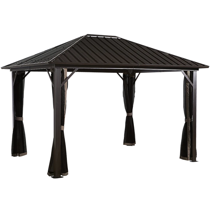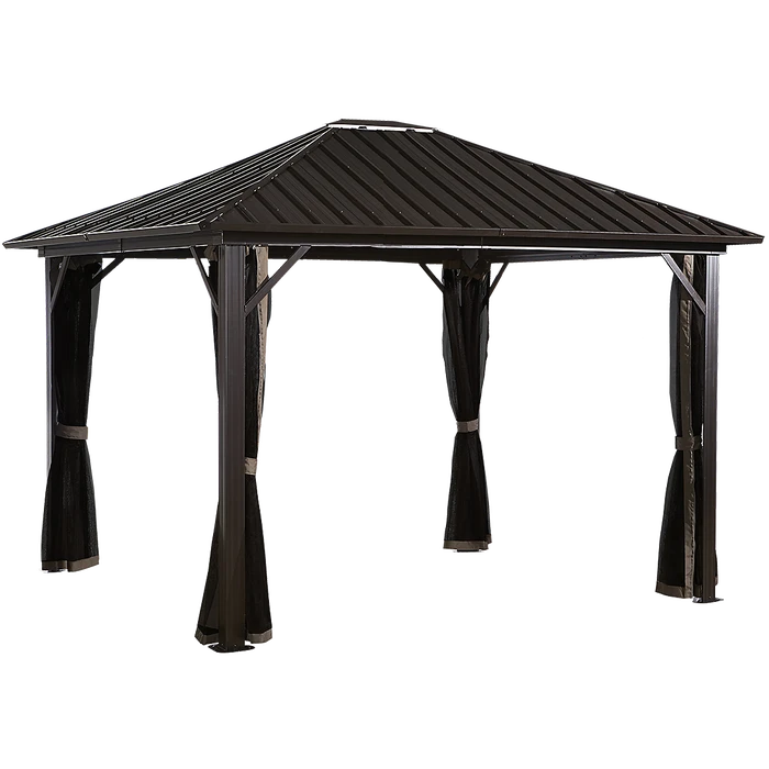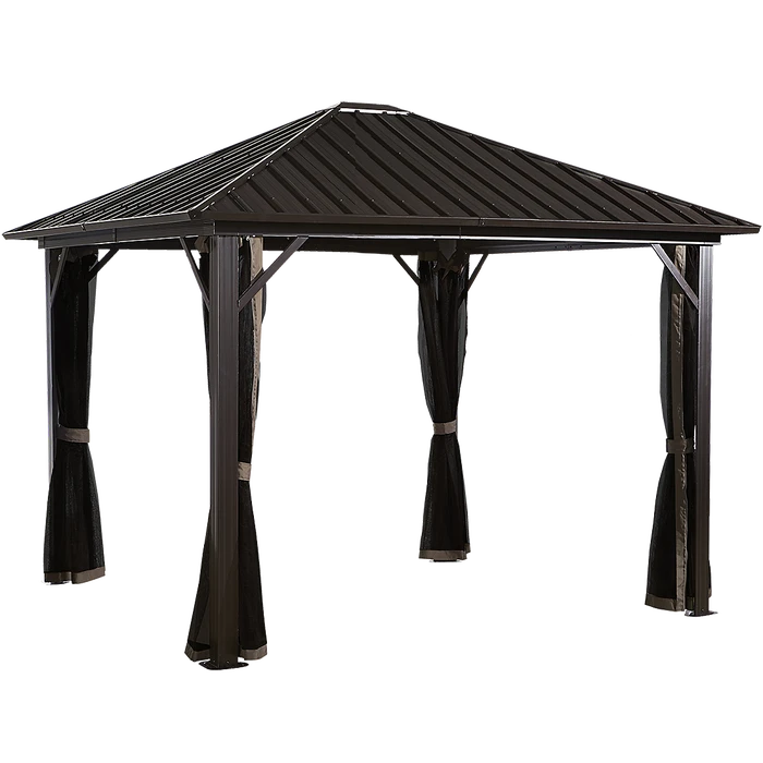 Enjoy your outdoor living space with the 4 season Sojag Genova Gazebo 10 x 10 ft. This attractive gazebo and sun shelter provides a shaded space to relax by the pool or in the backyard during hot summer days. It’s a haven for friends and family to gather for an intimate outdoor dining experience. It is at the forefront of the new wave of outdoor living structures with its durable galvanized steel roof and high-quality powder-coated aluminum frame. It includes one set of durable mosquito netting which also works to reduce wind and sun exposure. The Genova is built to last, providing years of protection from the elements.