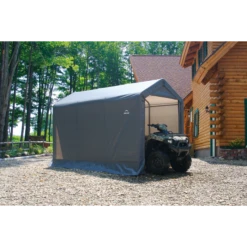 Delivers year-round protection for cars trucks, boats and more. Design features a peaked roof. Strong 1 3/8 In. steel frame and heavy-duty ripstop UV-treated 7.5 oz. waterproof fabric cover for a durable storage building. Includes zippered door, solid back panel and temporary anchoring system.