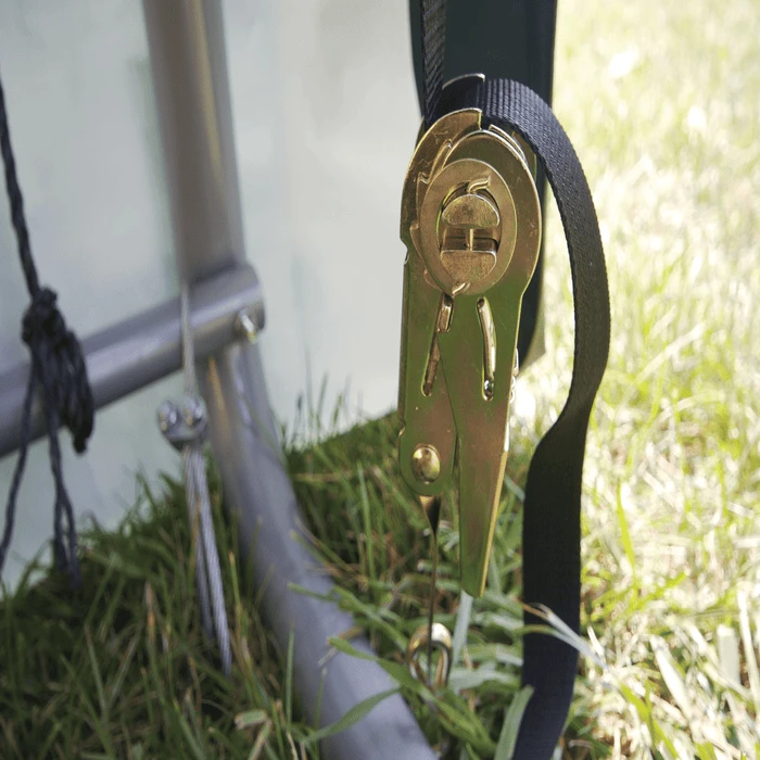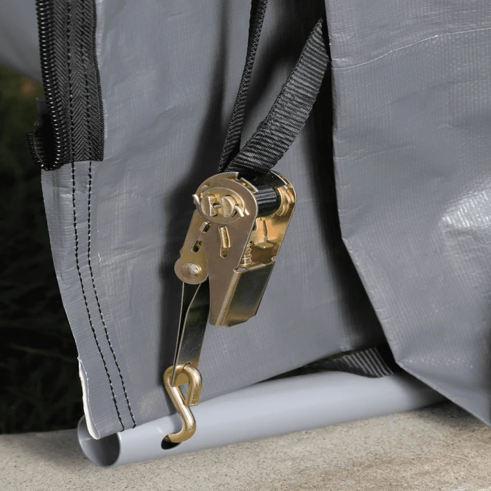 - Ratchet Tite cover tensioning system ensures a drum tight cover and door-panel connection to shelter frame. Quality ratchet and web strap components keep cover tight and neat looking.